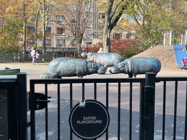 Safari Playground is a compact, safari‑themed play area in Central Park on the Upper West Side, tucked between Central Park West and the park’s West Drive near West 91st–93rd Streets, with views of the Jacqueline Kennedy Onassis Reservoir. It’s best known for its whimsical family of hippopotamus sculptures, which kids climb, sit on, and run around as part of free, imaginative play.